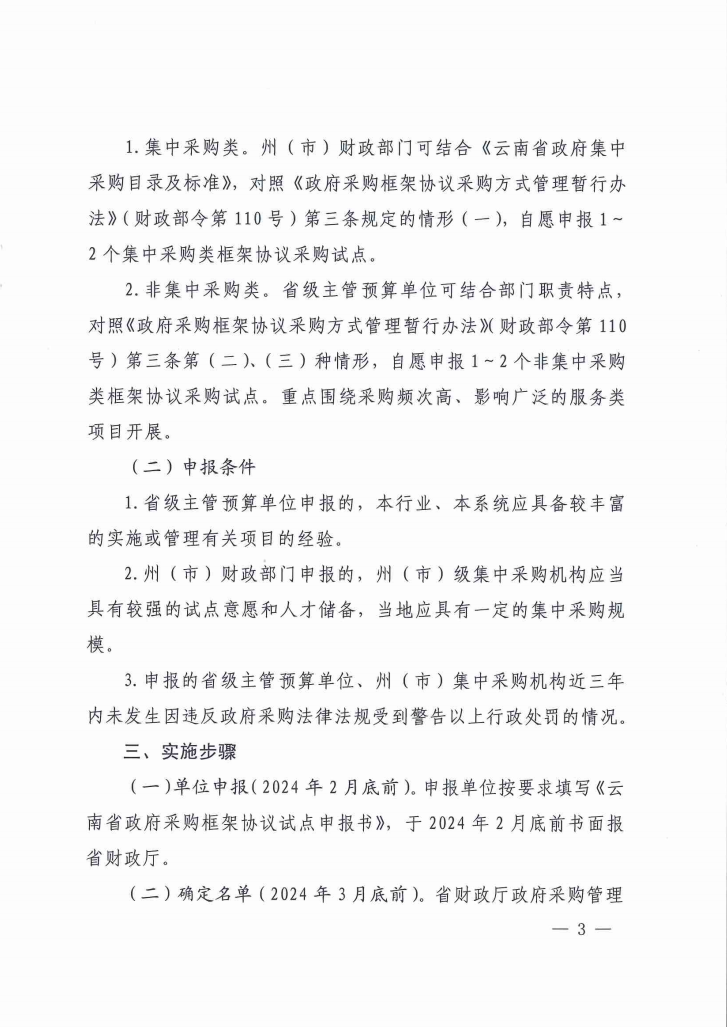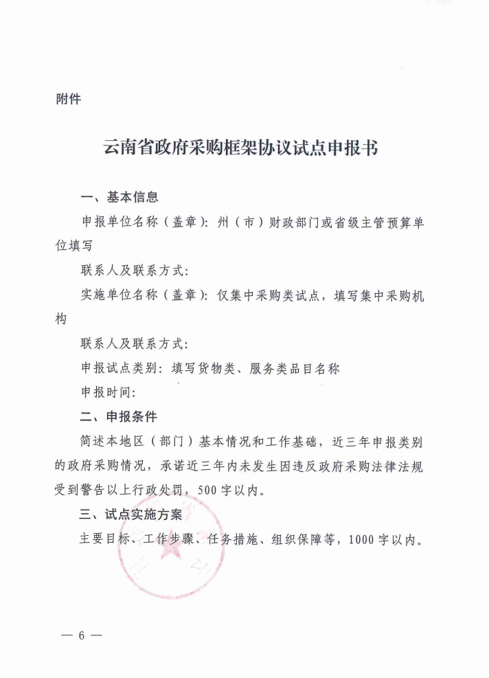 云南省财政厅印发《关于组织申报政府采购框架协议试点工作的通知》